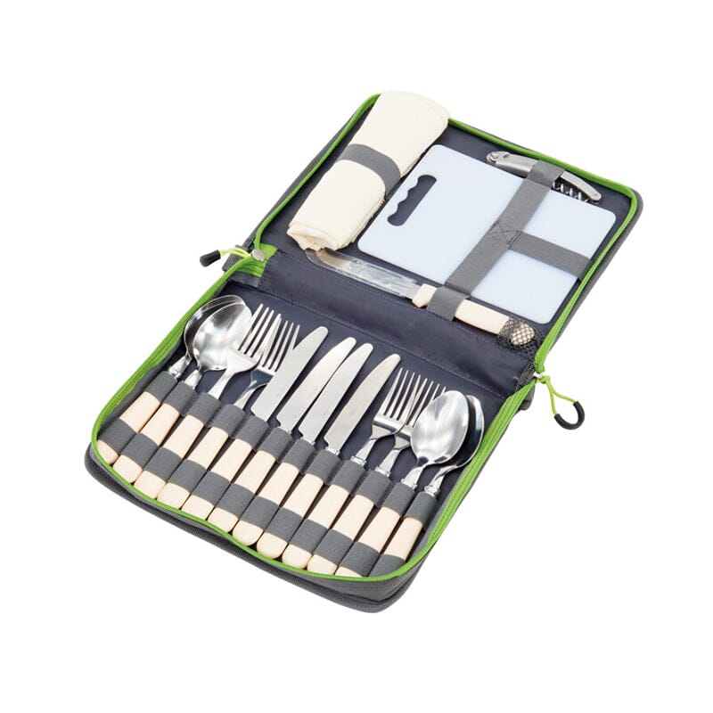 Outwell Piknik Bestikksett er et alt-ett-sett som tilbyr kniv, gaffel, skje og serviett for fire personer. I tillegg får du skjærebrett, ostekniv og flaskeåpner slik at du har alt du trenger i ett praktisk sett. Settet kommer i en nett og slitesterk veske som tar liten plass i sekken, eller du kan bære det som det er med et behagelig håndtak. Designet er kompakt og praktisk med en lomme på utsiden for oppbevaring av mindre gjenstander som mobiltelefon, bøker osv. Kvalitetsmaterialer på både innhold og bæreveske sørger for at settet tåler utendørsbruk over lang tid og passer perfekt for piknik, camping eller på stranden.