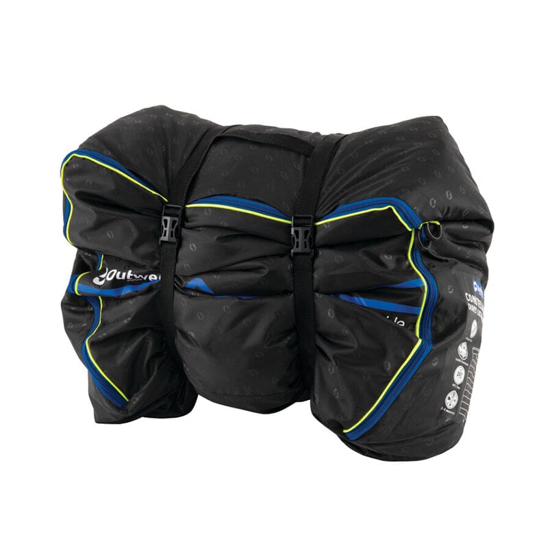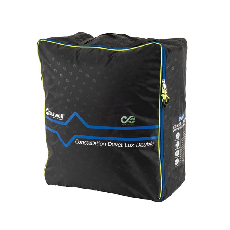 Outwell Dyne Constellation Duvet Lux Double pakkes kompakt sammen i en firkantet pakkepose med kompresjonsstropper, slik at den ikke tar mye plass i sekken. Den lar seg også vaske i vaskemaskin, opptil 60 grader, slik at du enkelt rengjør dynen.