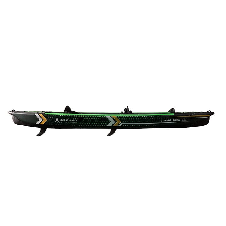Stone River 470 er en super, oppblåsbar kajakk for to personer. Den er konstruert med 100% drop-stitch material, noe som gjør den både robust og stabil. To gode seter, med høy rygg, gjør padlingen behagelig. I motsetning til Wild River, har Stone River høyere kanter slik at man er mer beskyttet mot vannet og holder seg lettere tørr. Stone River 470 kommer med to avtagbare finner som forbedrer stabiliteten når den er montert. Leveres komplett med ryggsekk, som kan trilles på hjul, årer i aluminium, finner, seter og pumpe.