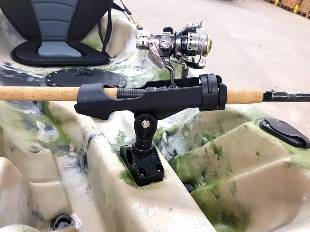 Flyttbar stangholder for effektivt og sikkert fiske fra kajakk. Kan roteres og vinkles etter behov, og kommer med en sikkerhetsbøyle som sikrer fiskestangen din, selv når ruggen biter!