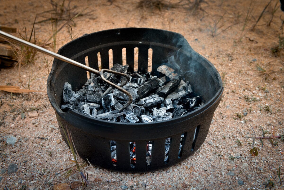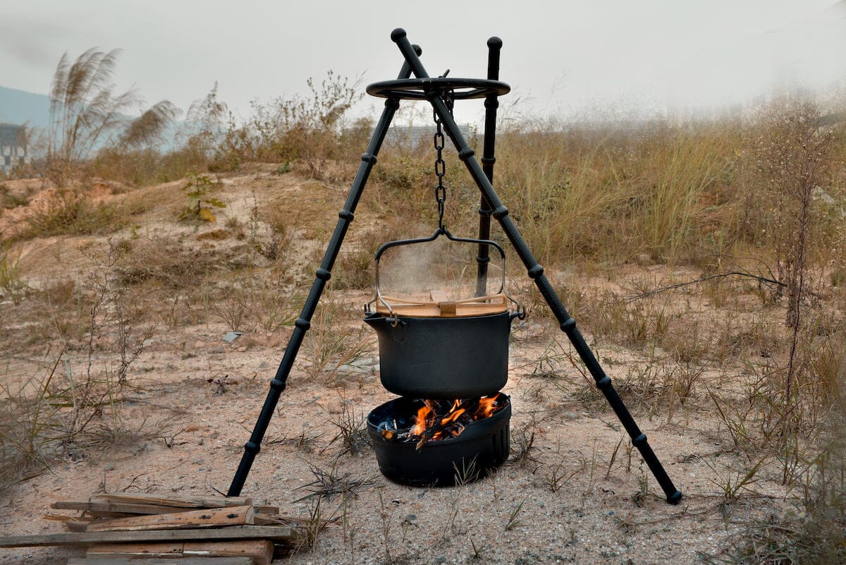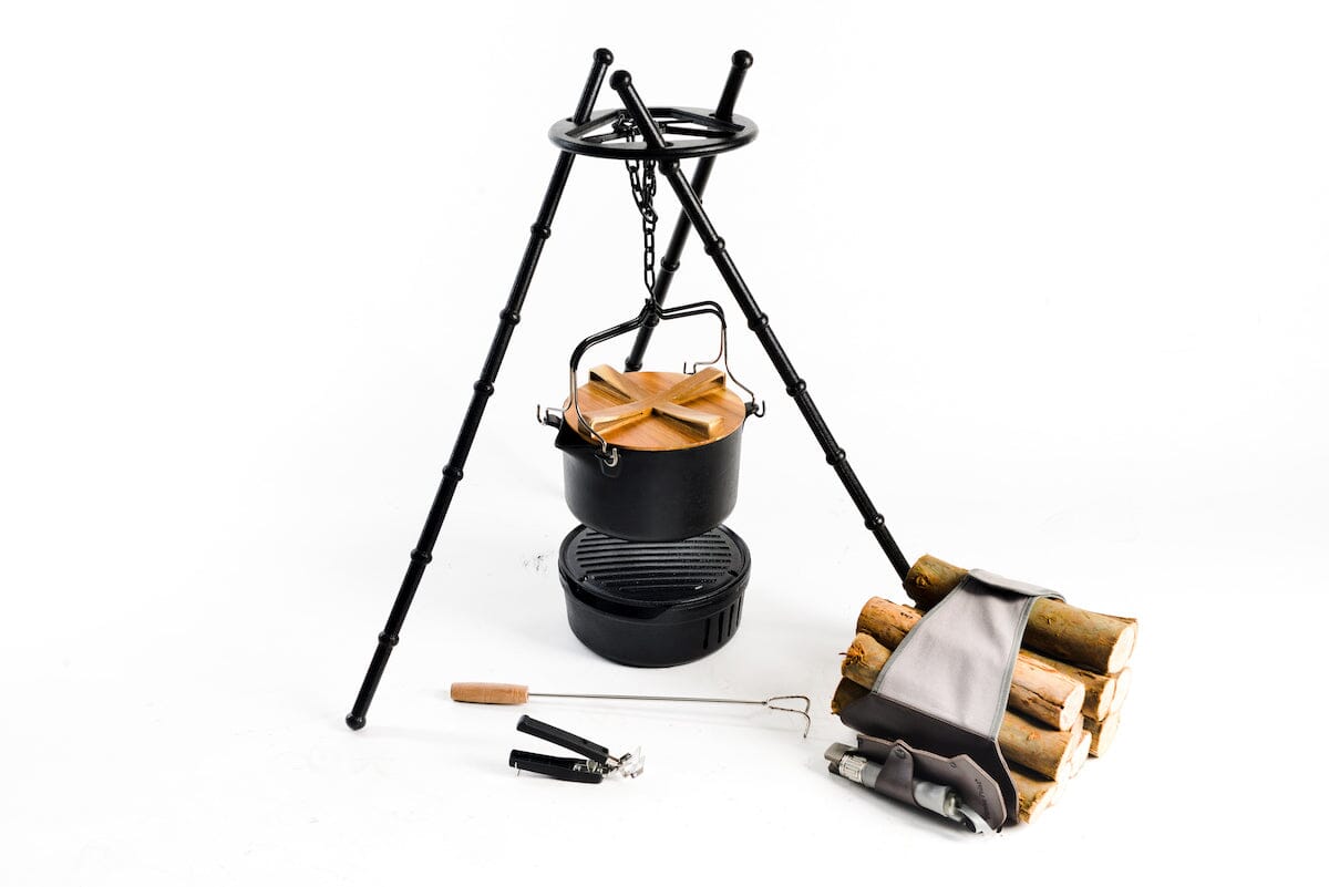 Super bålpanne i støpejern med flere funksjoner! Kan koke, grille eller steke. Fyr opp med ved, kull eller gass. Avtagbare deler gjør den enkel å rengjøre. Lokket i tre fungerer som skjærefjøl. Gjennomsnittlig koketid 3,5 minutter Stødig konstruksjon, tåler 20 kg