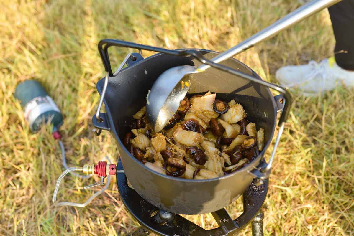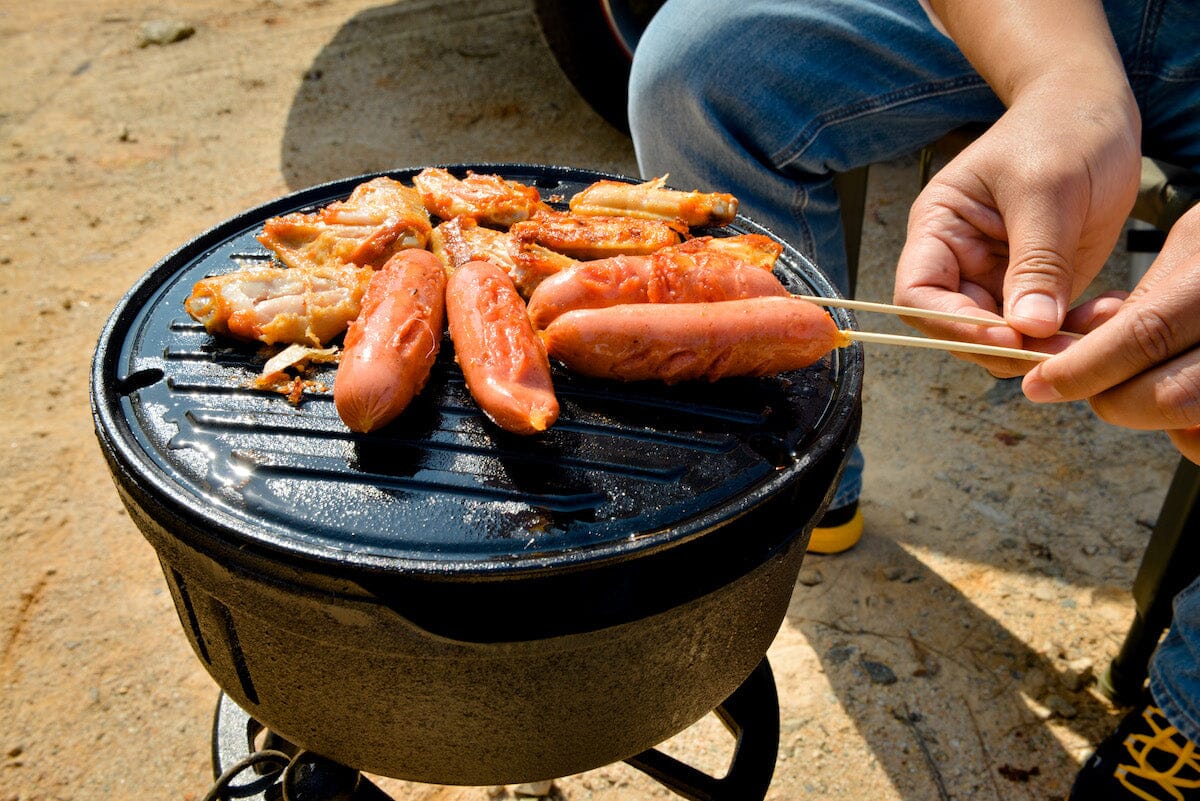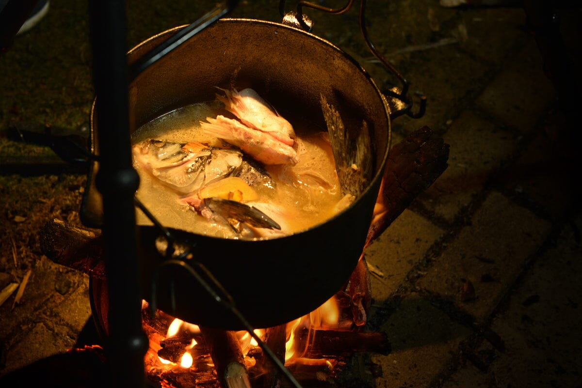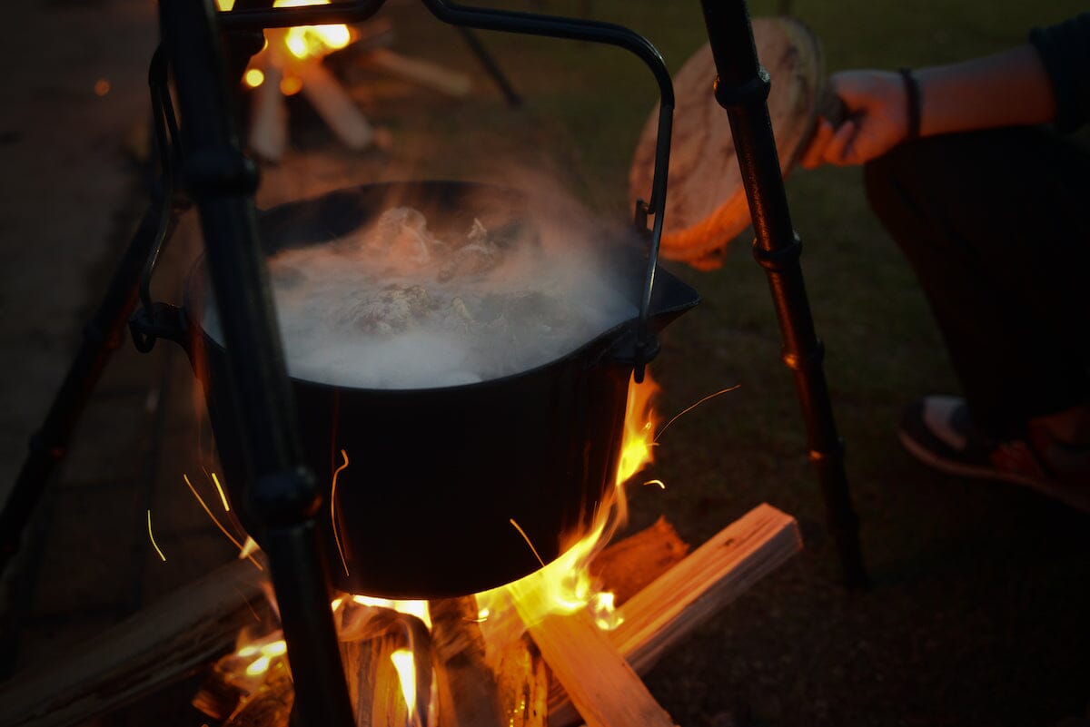 Super bålpanne i støpejern med flere funksjoner! Kan koke, grille eller steke. Fyr opp med ved, kull eller gass. Avtagbare deler gjør den enkel å rengjøre. Lokket i tre fungerer som skjærefjøl. Gjennomsnittlig koketid 3,5 minutter Stødig konstruksjon, tåler 20 kg