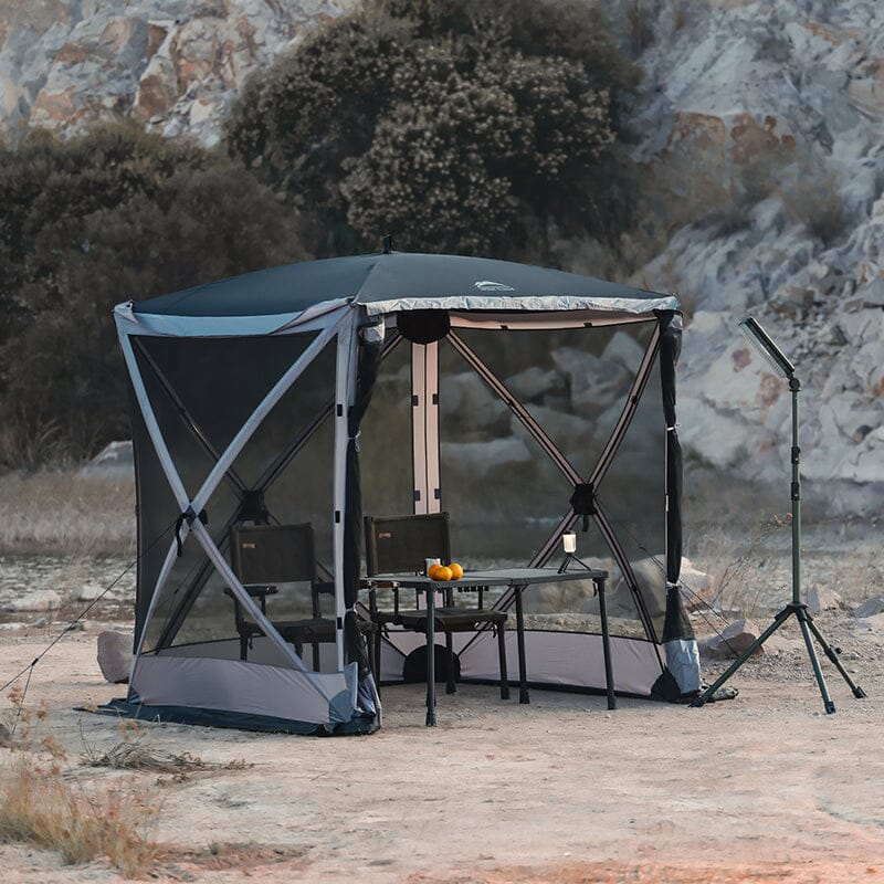 Wild Land Pop-Up Telt 400 krever ingen montering, og er klart til bruk rett ut av bagen. Du får fint plass til et bord og fire stoler i teltet. Flott for servering av mat til utendørs piknik når det blåser litt eller når været er litt kjøligere, eller som skygge for solen på varme sommerdager. Teltet kommer i en overdimensjonert bag, slik at det er enkelt å pakke ned. I tillegg medfølger markplugger, barduner og integrerte stenger i inngangen. Yttervegger for ekstra skjerming av sol, vind- og regn kjøpes separat dersom man ønsker det.